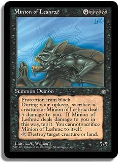 Protection from black, During your upkeep, sacrifice a creature or Minion of Leshrac deals 5 damage to you. If Minion of Leshrac deals damage to you in this way, tap it. You cannot sacrifice Minion of Leshrac to itself. <T>: Destroy target creature or land.