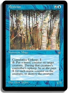 Cumulative Upkeep: <1>. <T>: Put a music counter on target creature. During that creature's controller's upkeep, he or she pays <1> for each music counter on the creature, or destroy the creature.