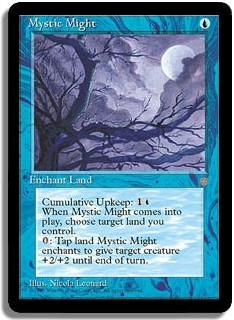 Cumulative Upkeep: <1U>. When Mystic Might comes into play, choose target land you control. <0>: Tap land Mystic Might enchants to give target creature +2/+2 until end of turn.