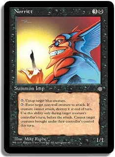 <T>: Untap target blue creature. <T>: Force target non-wall creature to attack. If creature cannot attack, destroy it at end of turn. Use this ability only during target creature's controller's turn, before the attack. Cannot target creatures brought under their controller's control this turn.