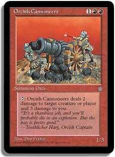 <T>: Orcish Cannoneers deals 2 damage to target creature or player and 3 damage to you.