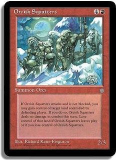 If Orcish Squatters attacks and is not blocked, you may gain control of target land controlled by defending player. If you do so, Orcish Squatters deals no damage in combat this turn. Lose control of that land if Orcish Squatters leaves play or if you lose control of Orcish Squatters.