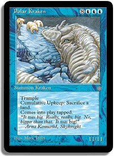 Trample. Cumulative Upkeep: <Sacrifice a land>. Comes into play tapped.