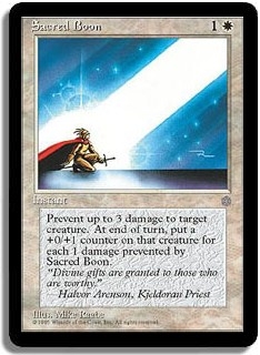 Prevent up to 3 damage to target creature. At end of turn, put a +0/+1 counter on that creature for each 1 damage prevented by Sacred Boon.