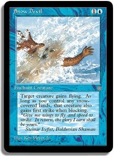 Target creature gains flying. As long as you control any snow-covered lands, that creature also gains first strike when blocking.