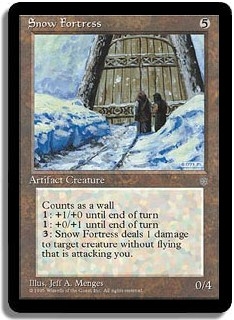 Counts as a wall <1>: +1/+0 until end of turn. <1>: +0/+1 until end of turn. <3>: Snow Fortress deals 1 damage to target creature without flying that is attacking you.