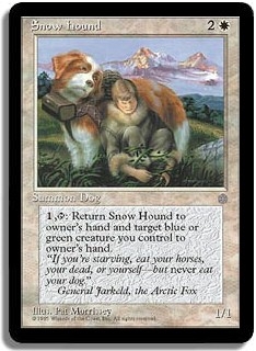 <1,T>: Return Snow Hound to owner's hand and target blue or green creature you control to owner's hand.