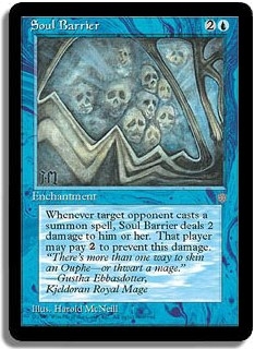 Whenever target opponent casts a summon spell, Soul Barrier deals 2 damage to him or her. That player may pay <2> to prevent this damage.