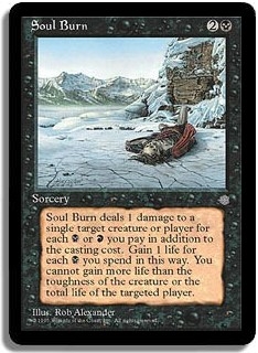 Soul Burn deals 1 damage to a single target creature or player for each <B> or <R> you pay in addition to the casting cost. Gain 1 life for each <B> you spend in this way. You cannot gain more life than the toughness of the creature or the total life of the targeted player.