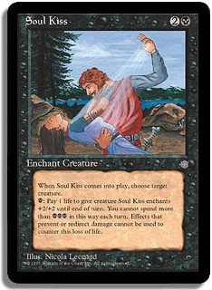 When Soul Kiss comes into play, choose target creature. <B>: Pay 1 life to give creature Soul Kiss enchants +2/+2 until end of turn. You cannot spend more than <BBB> in this way each turn. Effects that prevent or redirect damage cannot be used to counter this loss of life.