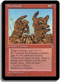 Target creature gets +0/+2. <R>: Creature Stonehands enchants gets +1/+0 until end of turn.