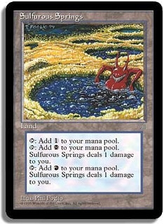 <T>: Add <1> to your mana pool. <T>: Add <B> to your mana pool. Sulfurous Springs deals 1 damage to you. <T>: Add <R> to your mana pool. Sulfurous Springs deals 1 damage to you.