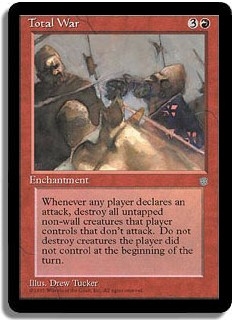 Whenever any player declares an attack, destroy all untapped non-wall creatures that player controls that don't attack. Do not destroy creatures the player did not control at the beginning of the turn.