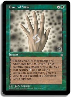 Target creature may untap one additional time this turn. That creature may attack or use abilities that require <T> as part of the activation cost this turn. Draw a card at the beginning of the next turn's upkeep.