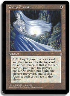 <3,T>: Target player names a card and then turns over the top card of his or her library. If that is the card named, put it into the player's hand. Otherwise, put it into the player's graveyard, and Vexing Arcanix deals 2 damage to that player.