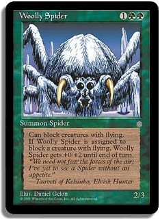 Can block creatures with flying. If Woolly Spider is assigned to block a creature with flying, Woolly Spider gets +0/+2 until end of turn.