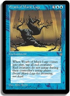 When Wrath of Marit Lage comes into play, tap all red creatures. Red creatures do not untap during their controller's untap phase.