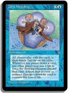 All players play with the cards in their hands face up on the table. Whenever any player draws a card, any other player may pay 2 life to force the drawing player to discard that card. Effects that prevent or redirect damage cannot be used to counter this loss of life.