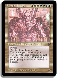 Flying. <W>: +0/+1 until end of turn. Your untapped creatures gain +0/+2. Attacking creatures do not get this bonus. Pay <WGU> during your upkeep or Arcades Sabboth is buried.