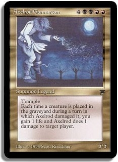 Trample. Each time a creature is placed in the graveyard during a turn in which Axelrod damaged it, you gain 1 life and Axelrod does 1 damage to target player.