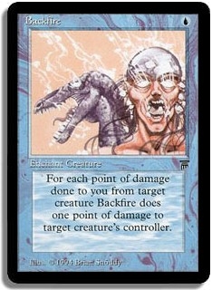 Backfire deals 1 damage to target creature's controller for each 1 damage dealt to you by that creature.