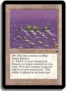 <2,T>: Put one counter on Blue Mana Battery. <T>: Add <U> to your mana pool. Remove as many counters as you wish. For each counter removed, add <U> to your mana pool. This ability is played as an interrupt.