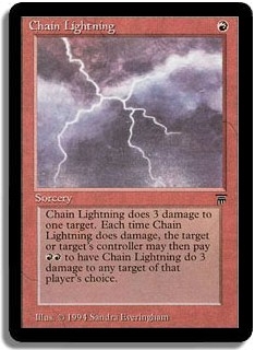 Chain Lightning does 3 damage to one target. Each time Chain Lightning does damage, the target or target's controller may then pay <RR> to have Chain Lightning do 3 damage to any target of that player's choice.