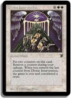Put two counters on this card. Remove a counter during your upkeep. When you remove the last counter from Divine Intervention, the game is over and considered a draw.