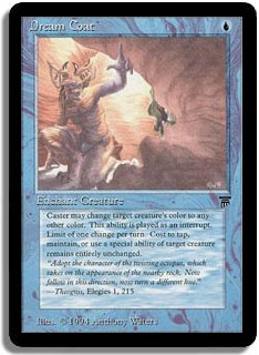 Caster may change target creature's color to any other color. This ability is played as an interrupt. Limit of one change per turn. Cost to tap, maintain, or use a special ability of target creature remains entirely unchanged.