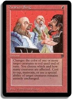 Changes the color of one or more target creatures to red until end of turn. You choose which and how many creatures are affected. Cost to tap, maintain, or use a special ability of target creatures remains entirely unchanged.