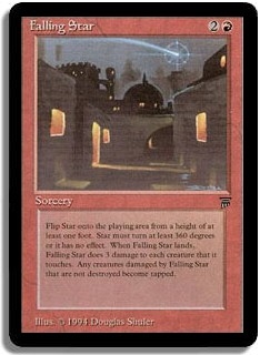 Flip Star onto the playing area from a height of at least one foot. Star must turn at least 360 degrees or it has no effect. When Falling Star lands, Falling Star does 3 damage to each creature that it touches. Any creatures damaged by Falling Star that are not destroyed become tapped.