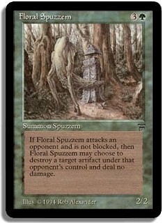 If Floral Spuzzem attacks an opponent and is not blocked, then Floral Spuzzem may choose to destroy a target artifact under that opponent's control and deal no damage.
