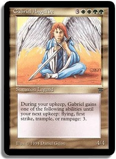 During your upkeep, Gabriel gains one of the following abilities until your next upkeep: flying, first strike, trample, or rampage: 3.