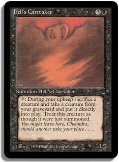 TAP: During your upkeep sacrifice a creature and e a creature from your graveyard and put it ectly into play. Treat this creature as though it e just summoned.