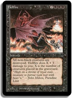 All non-black creatures are destroyed. Hellfire does X + 3 damage to you; X is the number of creatures placed in the graveyard.