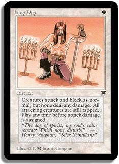 Creatures attack and block as normal, but none deal any damage. All attacking creatures are still tapped. Play any time before attack damage is assigned.