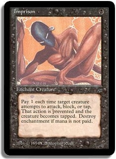 Pay <1> each time target creature attempts to attack, block, or tap. That action is prevented and the creature becomes tapped. Destroy enchantment if mana is not paid.