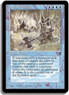If opponent casts a Summon spell that does not match the color of one of the creatures under your control, that spell is countered unless the caster pays an additional <X>, where X is the casting cost of the Summon spell.