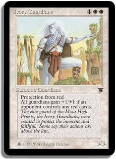 Protection from red. All guardians gain +1/+1 if an opponent controls any red cards.