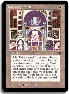 <2,T>: Take a card from your library without looking at it and place it face down under Knowledge Vault. Sacrifice Knowledge Vault to discard entire hand and take the cards under the vault into your hand. If Knowledge Vault leaves play, put all cards under it in your graveyard.