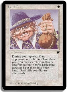During your upkeep, if an opponent controls more land than you, you may search your library and remove up to three basic land cards and put them into your hand. Reshuffle your library afterwards.