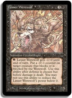 <B>: Lesser Werewolf gets -1/-0 until end of turn. Put a -0/-1 counter on target creature that blocks or is blocked by the Werewolf. Use this ability after defense is chosen but before damage is dealt. You may not use this ability to reduce the Lesser Werewolf's power below 0.