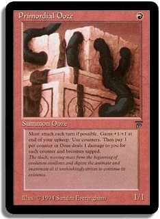 Must attack each turn if possible. Gains +1/+1 at end of your upkeep. Use counters. Then pay <1> per counter or Ooze deals 1 damage to you for each counter and becomes tapped.