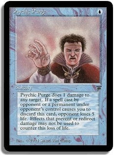 Psychic Purge does 1 damage to any target. If a spell cast by opponent or a permanent under opponent's control causes you to discard this card, opponent loses 5 life. Effects that prevent or redirect damage may not be used to counter this loss of life.