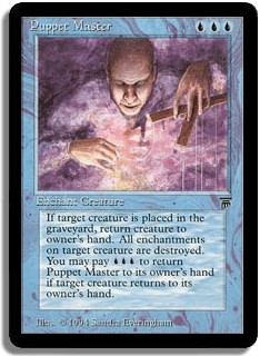 If target creature is placed in the graveyard, return creature to owner's hand. All enchantments on target creature are destroyed. You may pay <UUU> to return Puppet Master to its owner's hand if target creature returns to its owner's hand.