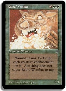 Wombat gains +2/+2 for each creature enchantment on it. Attacking does not cause Rabid Wombat to tap.