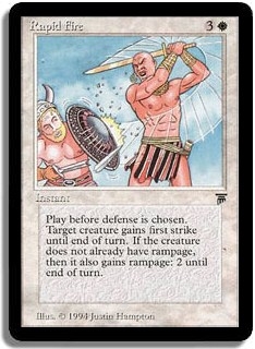 Play before defense is chosen. Target creature gains first strike until end of turn. If the creature does not already have rampage, then it also gains rampage: 2 until end of turn.