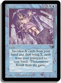 Sacrifice X cards from your hand and then bring X cards from your graveyard to your hand. Then remove Recall from the game.