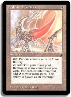 <2,T>: Put one charge counter on Red Mana Battery. <T>: Add <R> to your mana pool and remove as many charge counters as you wish. For each charge counter removed from Red Mana Battery, add <R> to your mana pool. Play this ability as an interrupt.