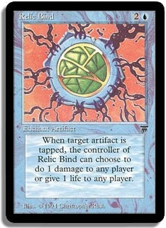 When target artifact opponent controls becomes tapped, you may give 1 life or have Relic Bind deal 1 damage to target player.
